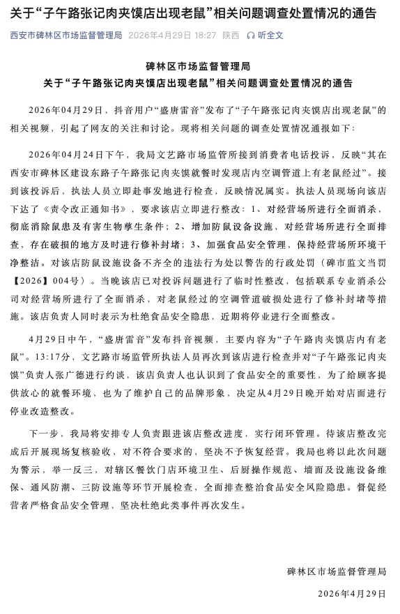 2026年4月29日,抖音用户“盛唐雷音”发布了“子午路张记肉夹馍店出现老鼠”的相关视频,引起了网友的关注和讨论。现将相关问题的调查处置情况通报如下:
