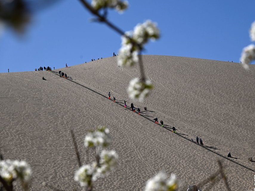 4月24日,游客在敦煌鸣沙山上游玩。 新华每日电讯记者 陈斌 摄