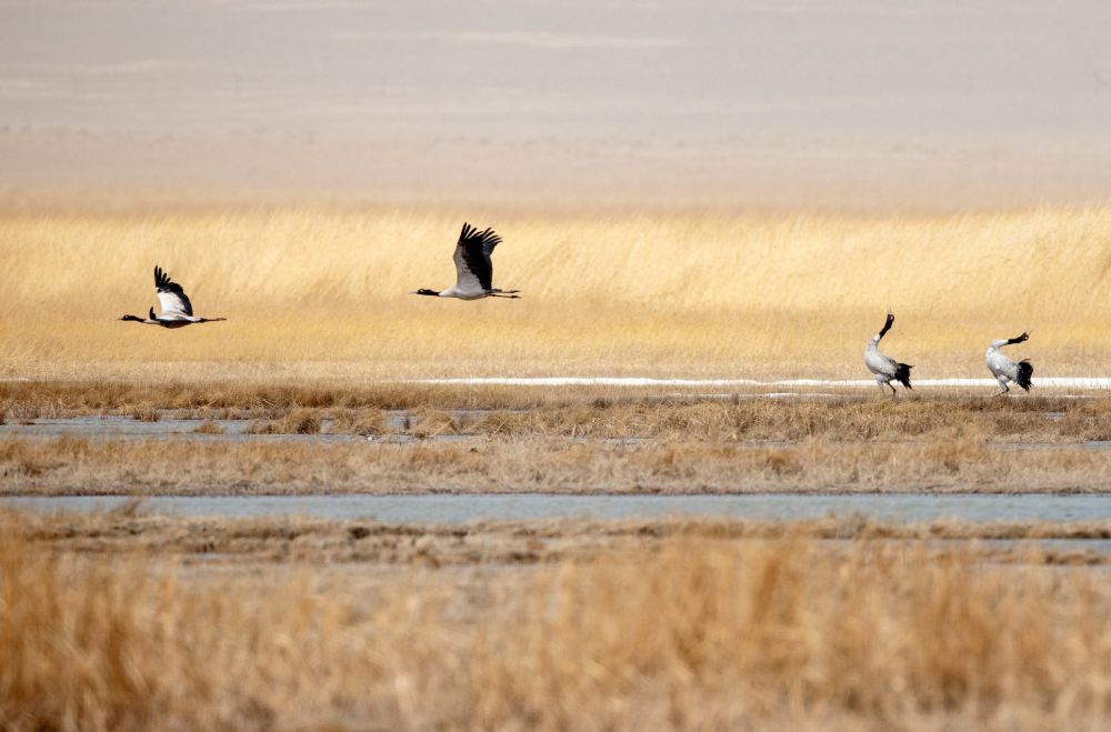 2023年4月9日,在甘肃省酒泉市阿克塞哈萨克族自治县阿伊纳乡苏干湖湿地,黑颈鹤翩翩起舞。新华每日电讯发高宏善摄