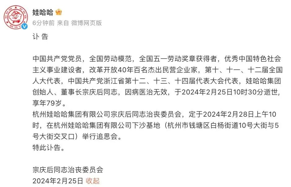 2024年2月25日,宗庆后同志因病医治无效逝世,享年79岁。