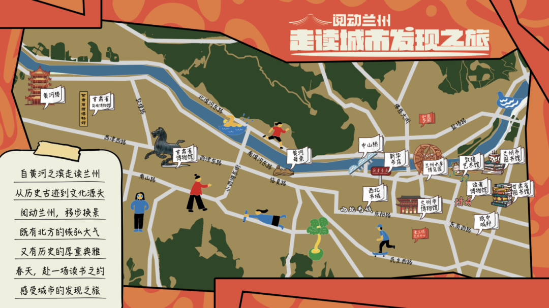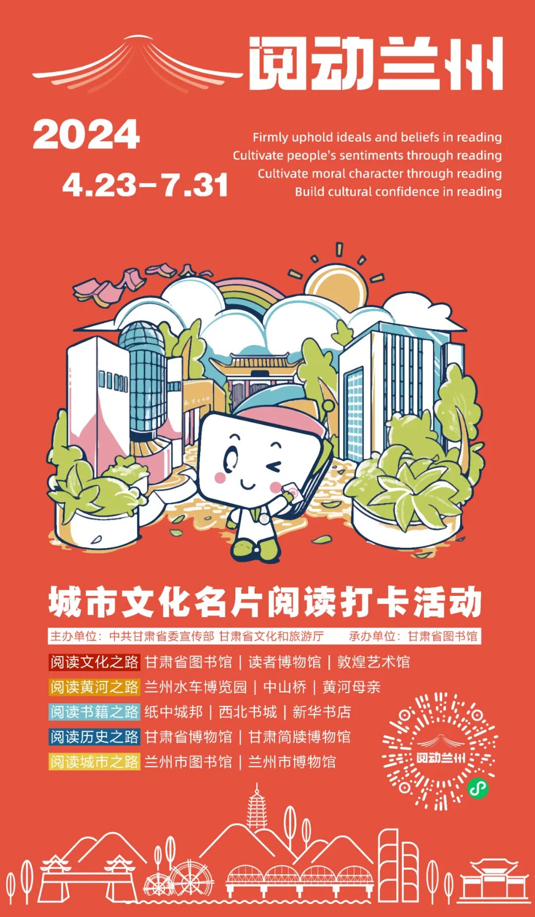 “阅动兰州”城市文化名片阅读打卡活动作为第四届“陇韵书香季”启动仪式重点活动,由甘肃省图书馆联合读者出版集团、甘肃省博物馆、甘肃简牍博物馆、敦煌艺术馆、兰州市图书馆、兰州市博物馆、西北书城、纸中城邦、新华书店(张掖路店)、中山桥、兰州水车博览园、黄河母亲共13家文化单位共同发起,向市民读者推荐5条阅读打卡路线。