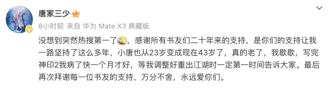 随后,唐家三少本人发文回应:感谢所有书友们二十年来的支持,从23岁变成现在43岁了,真的老了,我歇歇,写完神印2我病了快一个月才好,等我调整好重出江湖时一定第一时间告诉大家。