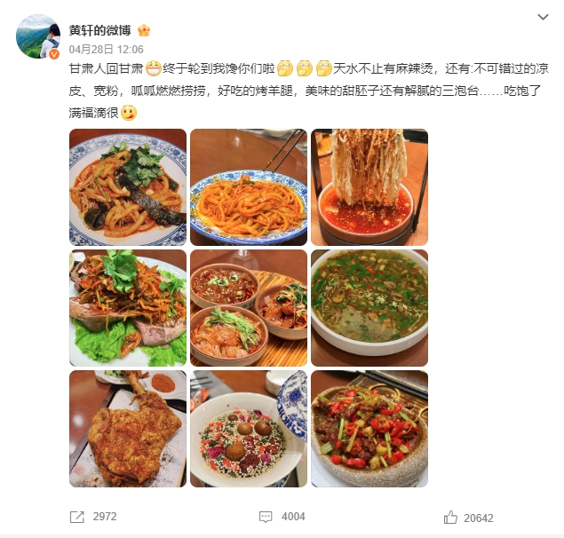 黄轩还在微博亲晒美食