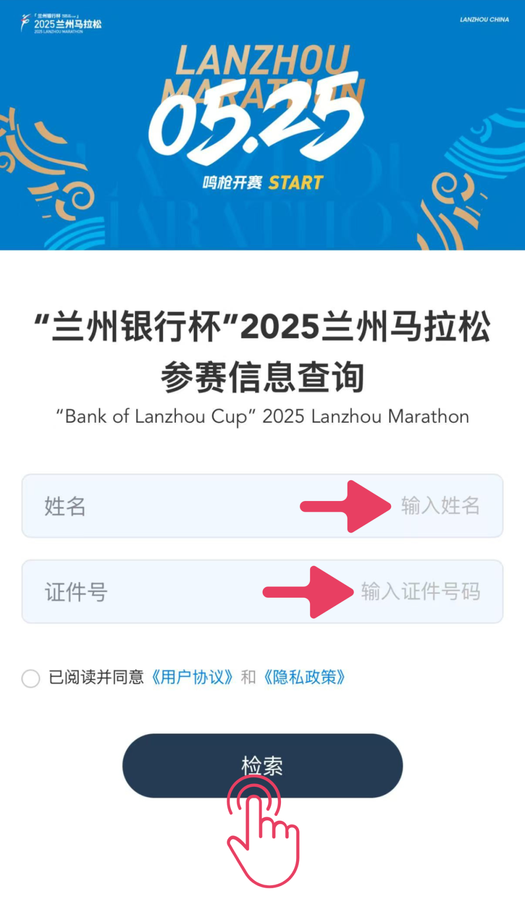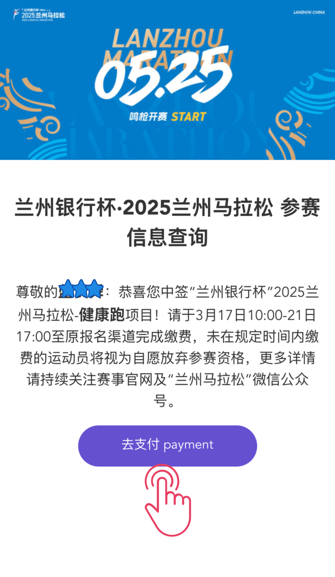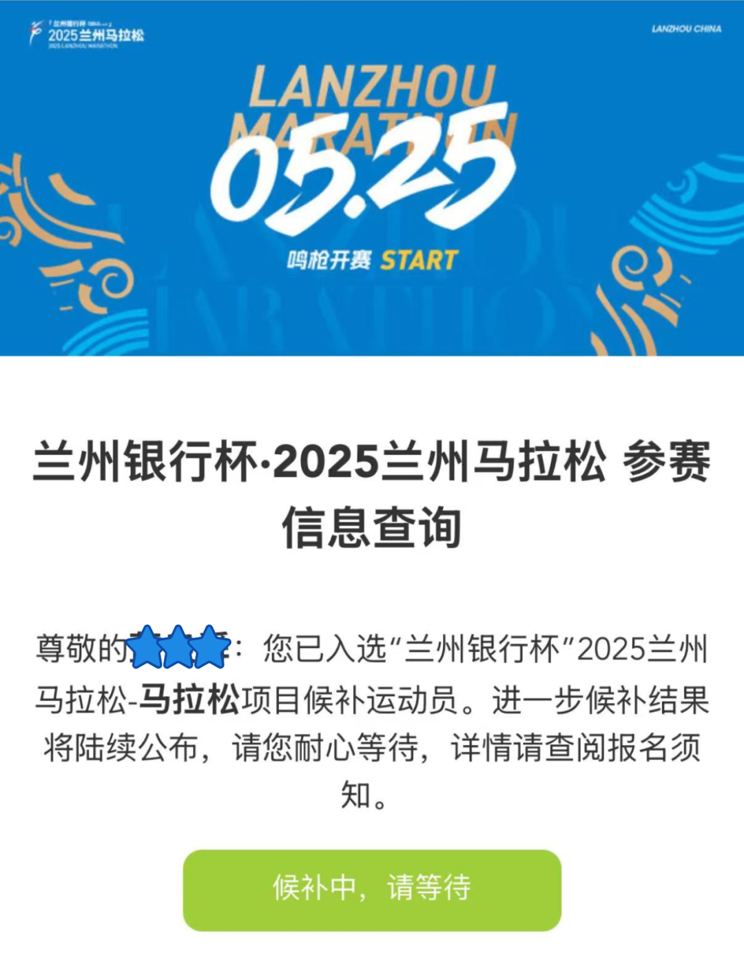 🔷关注「兰州马拉松」公众号,点击菜单栏【报名】→【中签查询】,输入证件号码查询。