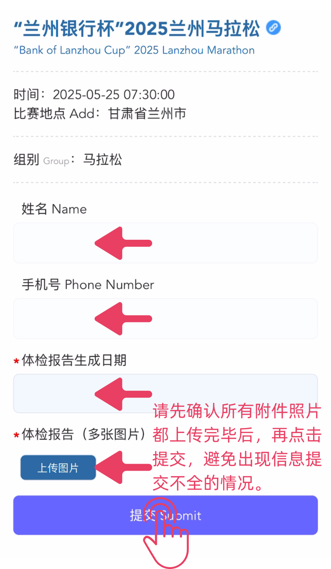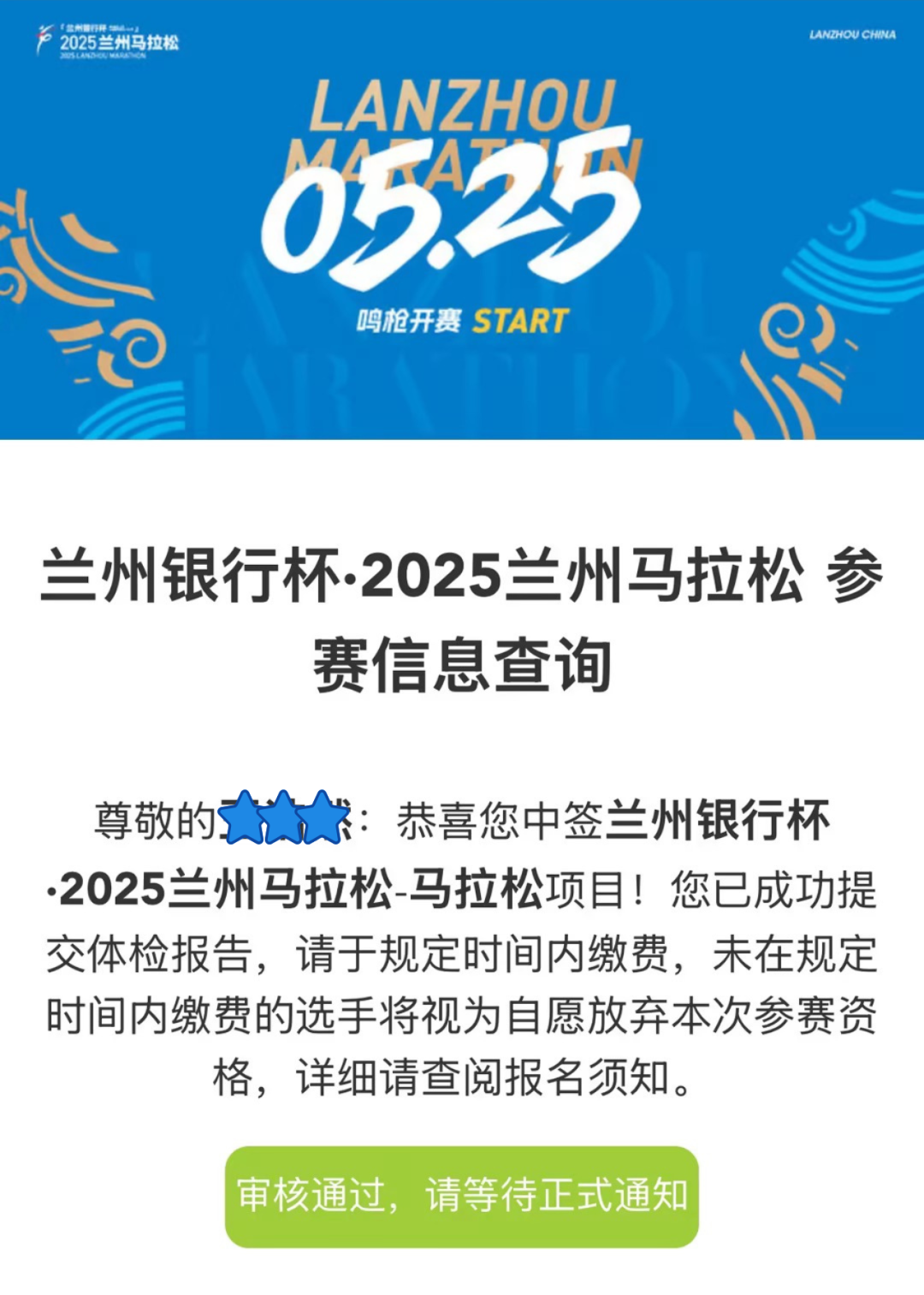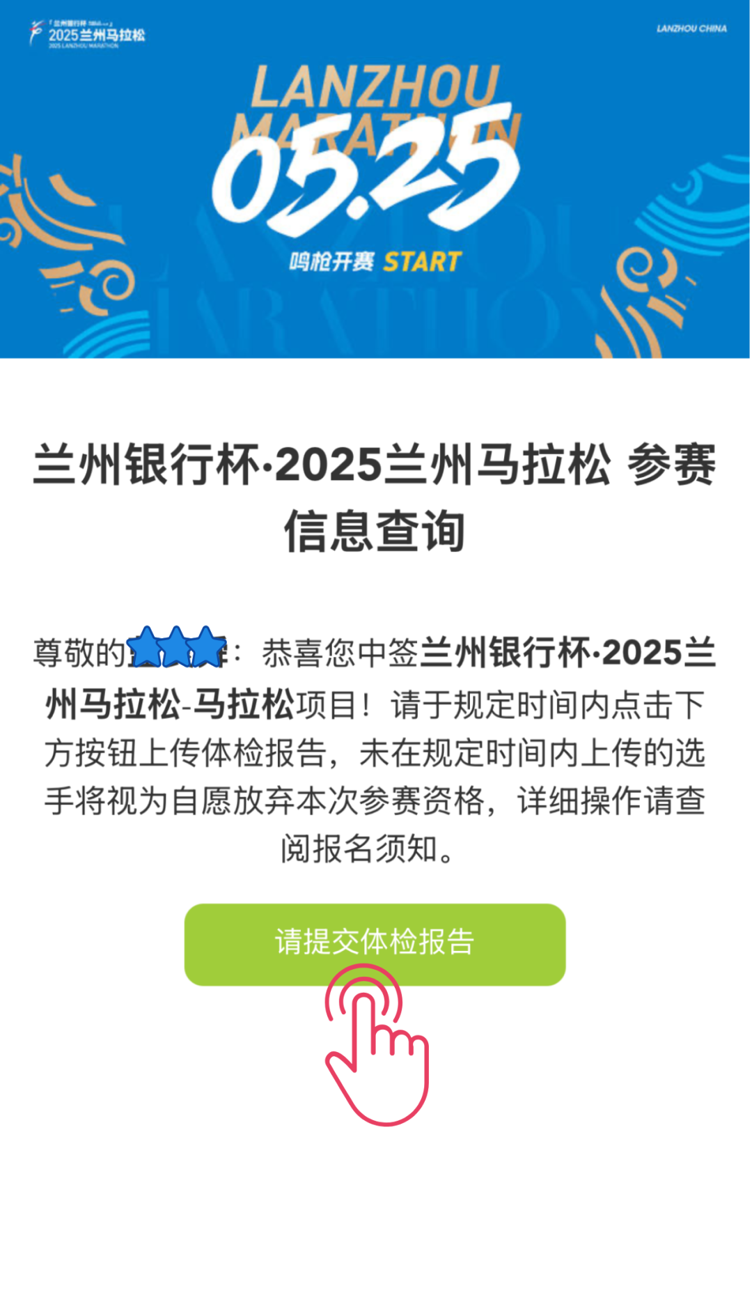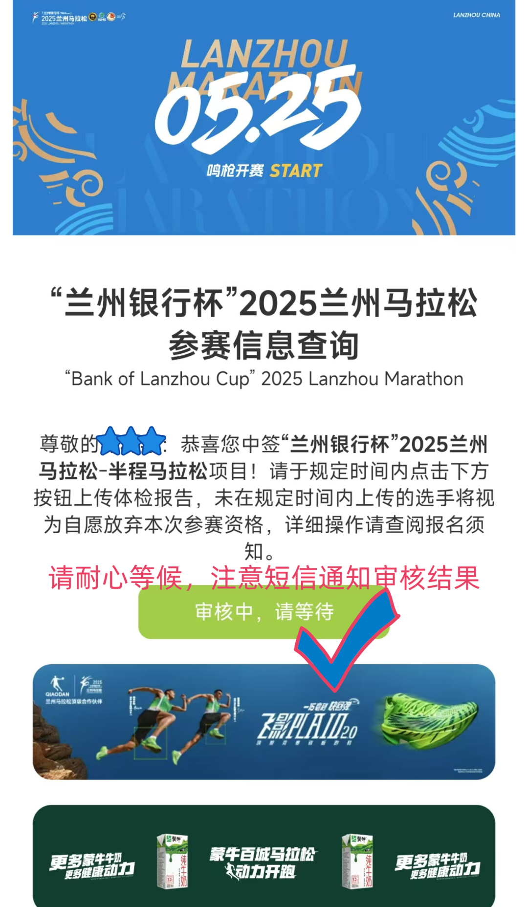 🔹按时上传体检报告的运动员,若在审核过程中出现缺失材料的,组委会将短信通知,并且给予选手重新提交的机会,请运动员耐心等待。