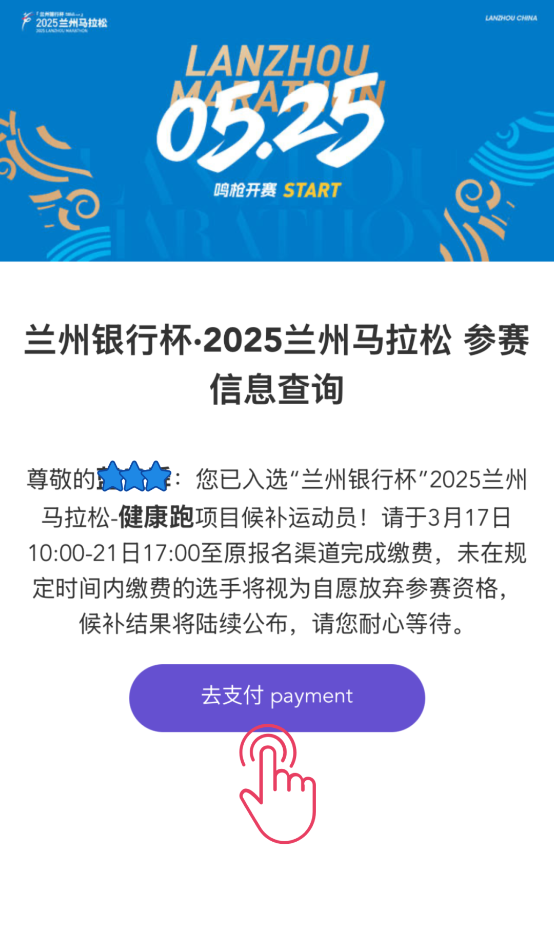 🔹入选候补运动员,请于3月17日10:00-3月21日17:00期间完成缴费,以确保候补资格。逾期未付款的运动员,视为主动放弃本次候补资格。组委会将于3月22日起,以短信形式陆续通知成功候补的运动员,直至满额。