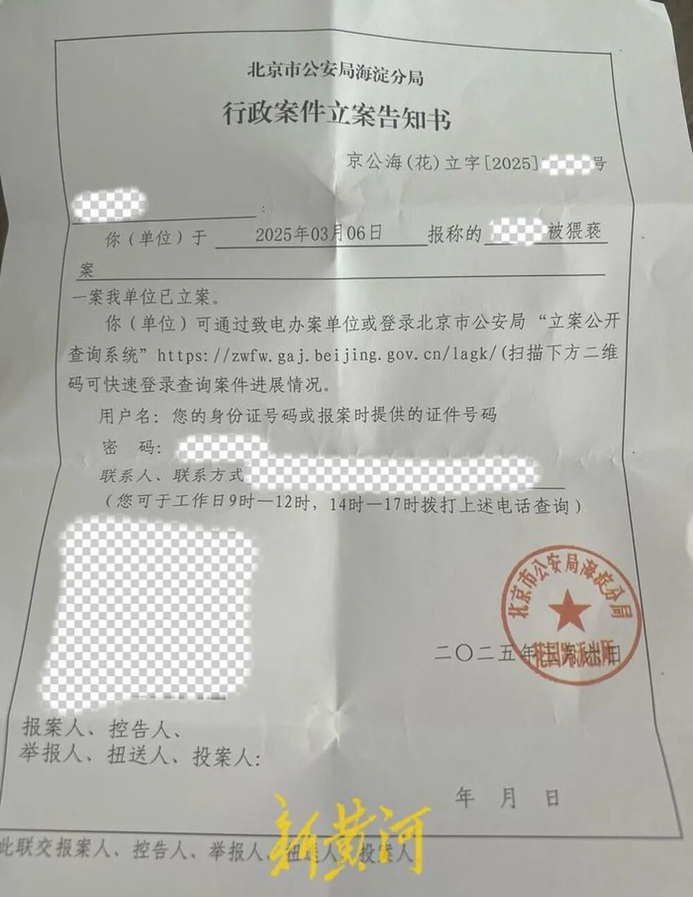 当晚,晓静前往公安机关提取了DNA。根据晓静提供的行政案件立案告知书内容显示,针对晓静报警称的被猥亵案,北京市公安局海淀分局花园路派出所已于3月6日受理并立案。
