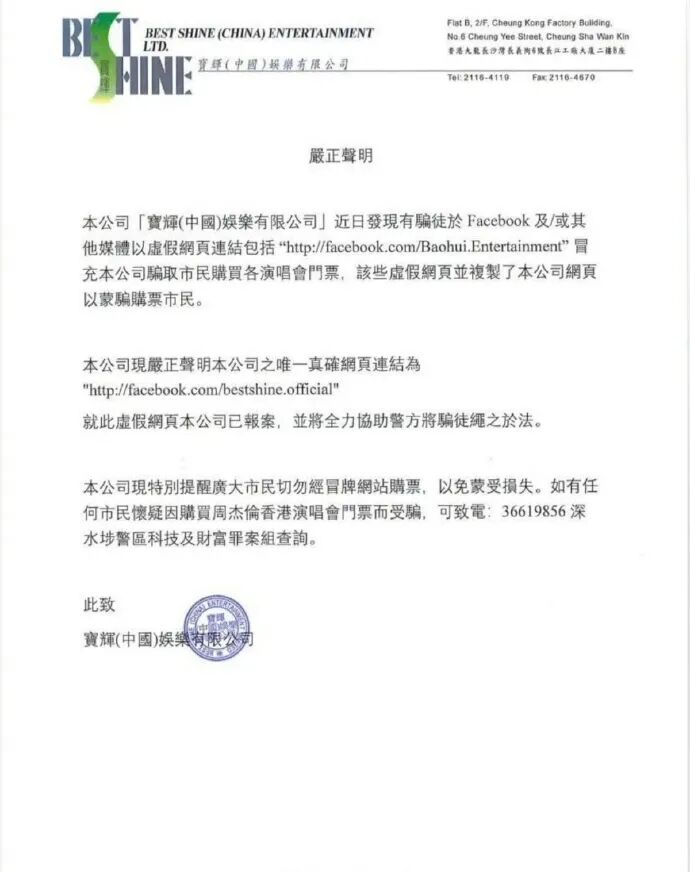 声明指出,公司特别提醒广大市民切勿在冒牌网站购票,以免遭受损失。如有任何市民怀疑因购买周杰伦香港演唱会的门票而受骗,可致电警方查询。
