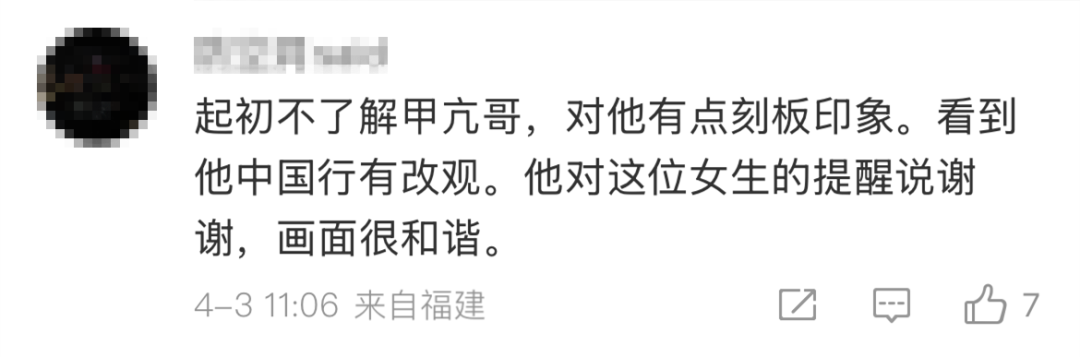 4月2日,“甲亢哥”体验坐轻轨,到站时他激动地在车厢和站台之间跳来跳去。一位同车女生看到后用英文友善提醒:这个行为有点危险,不要教孩子这样做。甲亢哥也点头表示:谢谢提醒!