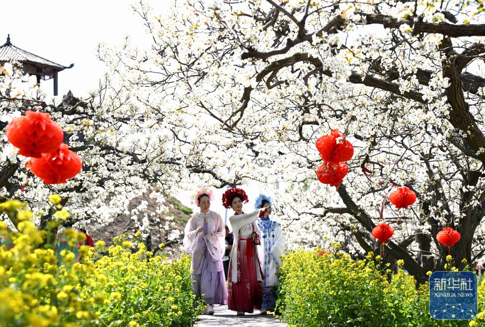 ↑ 4月2日,游客在河北省石家庄市赵县谢庄镇梨果生产基地观光拍照。新华社发(陈其保摄)