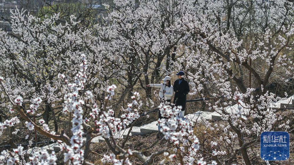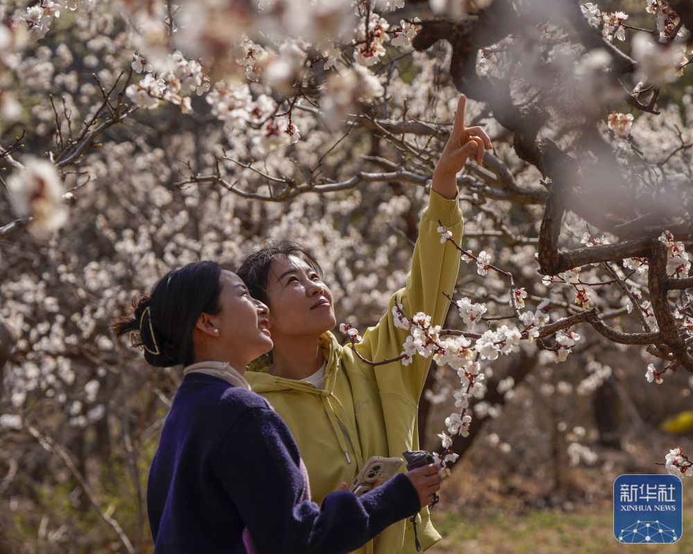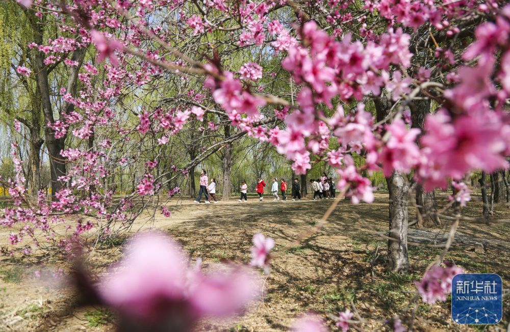 ↑ 4月3日,游客在河北省遵化市南山常乐谷景区赏花游玩。新华社发(刘满仓摄)