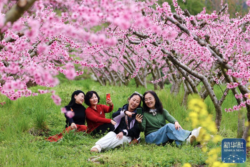 ↑ 4月1日,游客在重庆市黔江区濯水镇乌杨社区黄桃基地赏花游玩。新华社发(杨敏摄)