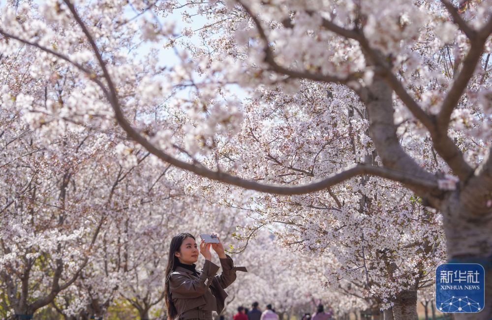 ↑ 4月2日,游客在山东省淄博文昌湖省级旅游度假区樱花园赏花游玩。新华社发(董乃德摄)