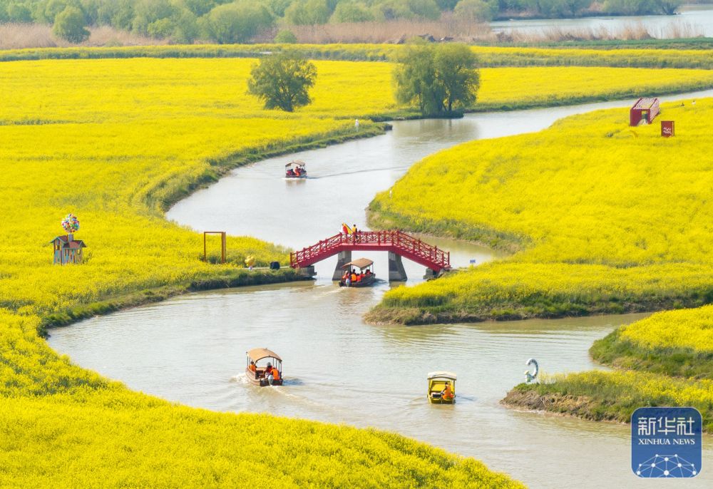 ↑ 4月3日,游客在江苏省高邮市湖上花海景区赏花游玩(无人机照片)。新华社发(周社根摄)