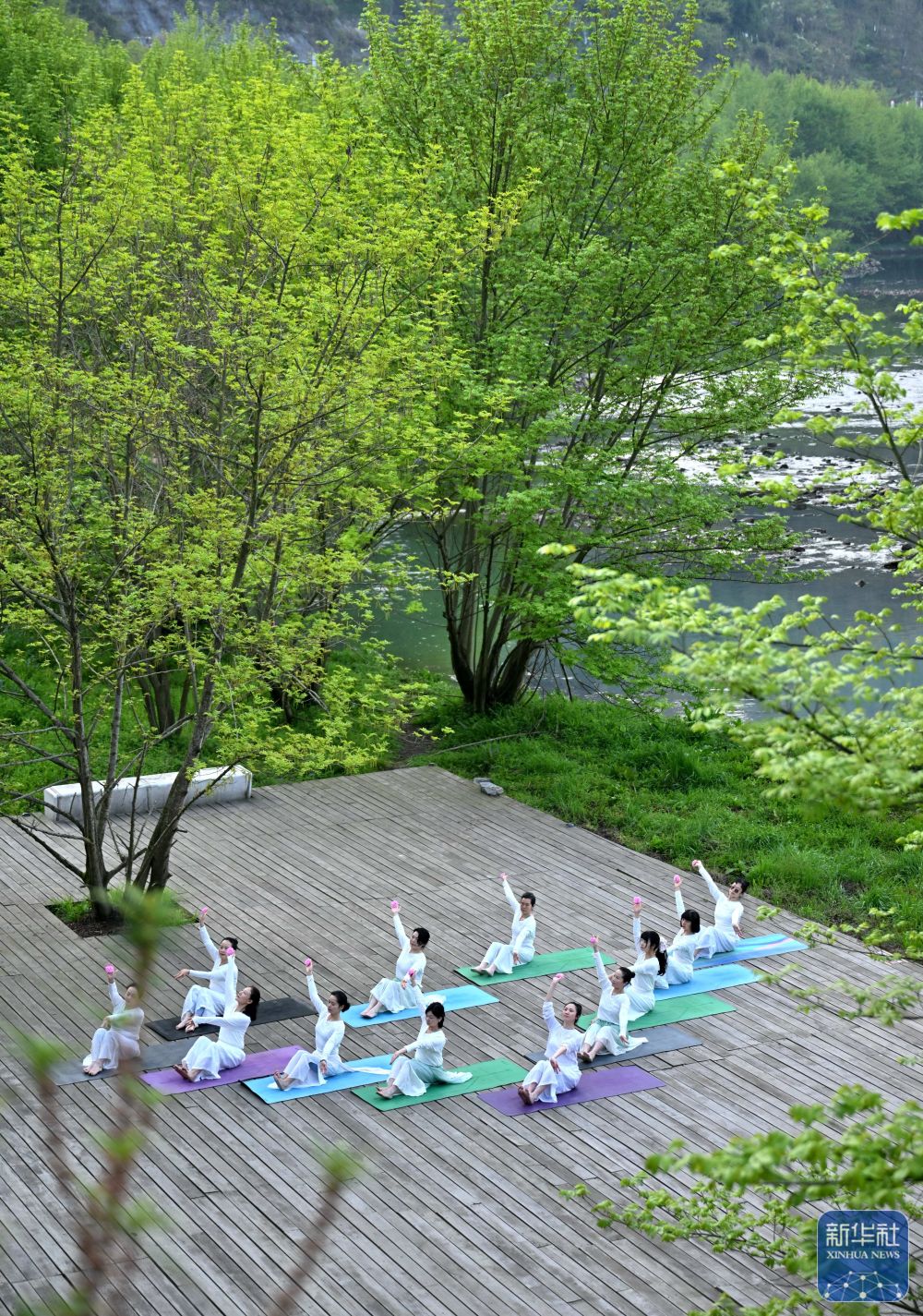 ↑ 4月3日,市民在湖北省宣恩县城贡水河畔晨练。新华社发(宋文摄)