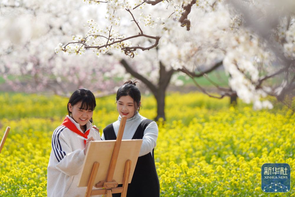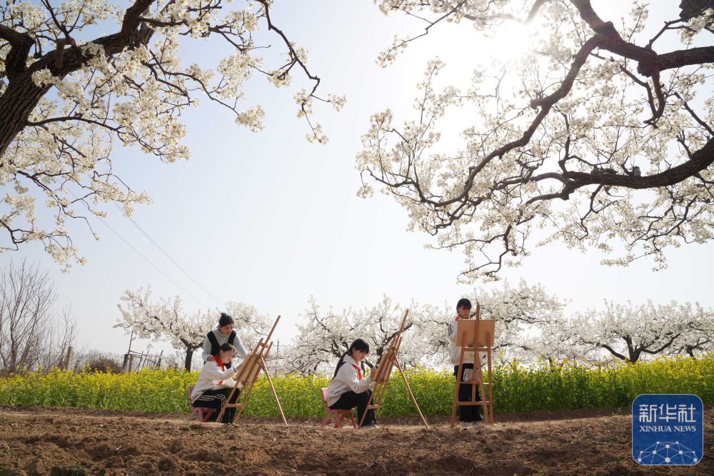 ↑ 4月3日,河北省邢台市内丘县大都城小学学生在果园写生。新华社发(刘继东摄)