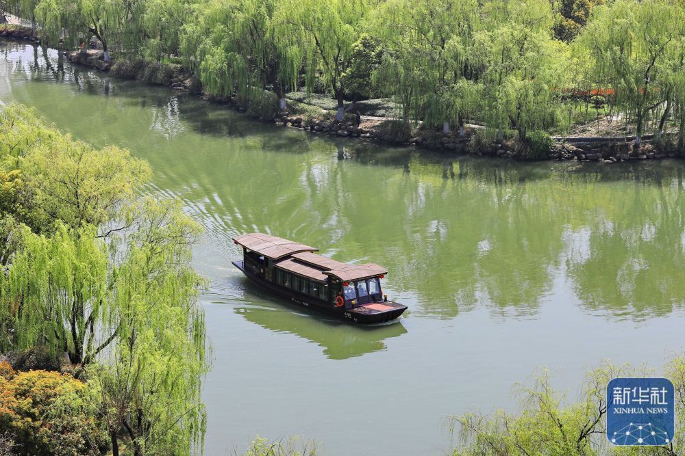 ↑ 4月3日,游船从浙江省嘉兴市南湖风景区湖面驶过。新华社发(金鹏摄)