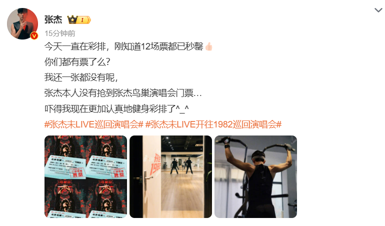 张杰表示:“今天一直在彩排,刚知道12场票都已秒罄你们都有票了么?我还一张都没有呢,张杰本人没有抢到张杰鸟巢演唱会门票……吓得我现在更加认真地健身彩排了。”