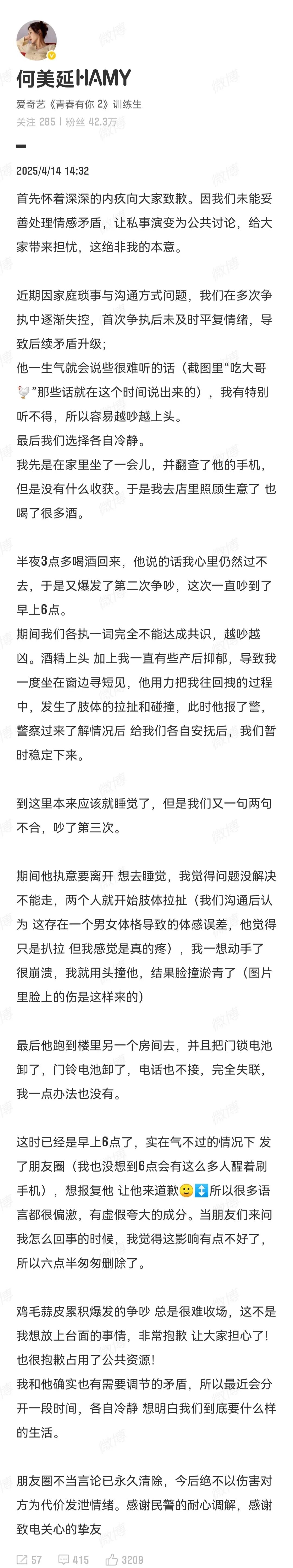 下午,何美延长文回应并复盘,表示是吵架引发的矛盾和肢体冲突。