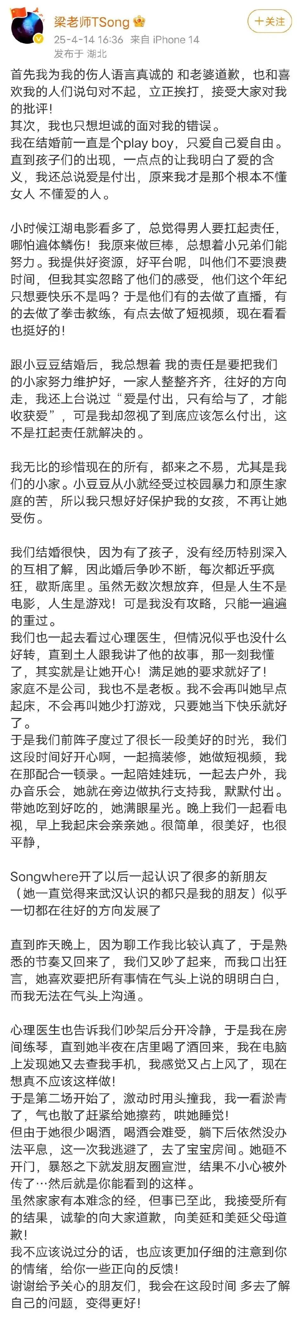 随后,梁老师发文回应,向妻子何美延道歉,表示两人没有经历特别深入的互相了解,因此婚后争吵不断, 两人都去看了心理医生但情况也没什么好转。