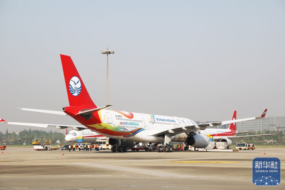 4月18日,首架“成都世运号”主题涂装飞机亮相成都双流国际机场并成功启航,执行首次运输任务飞往江苏无锡。