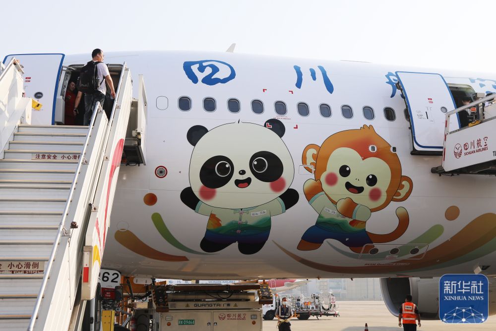 “成都世运号”机身以世运会主视觉为核心设计理念,喷涂“蜀宝”“锦仔”双吉祥物,展现成都生态宜居、热情友好的城市形象;同时,根据“世运会标准视觉元素”进行深化设计,以中国红、金沙黄、公园绿、熊猫黑、雪山白为主色调,凸显了中国传统元素和成都特色。