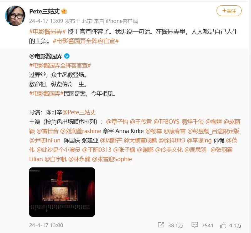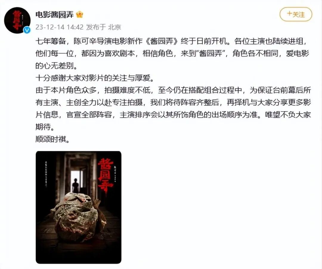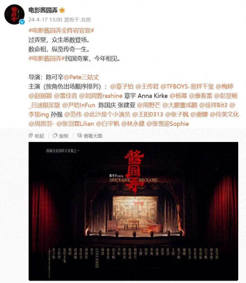 官宣后,该片导演陈可辛发文回应:“终于官宣阵容了。我想说一句话。在酱园弄里,人人都是自己人生的主角。”