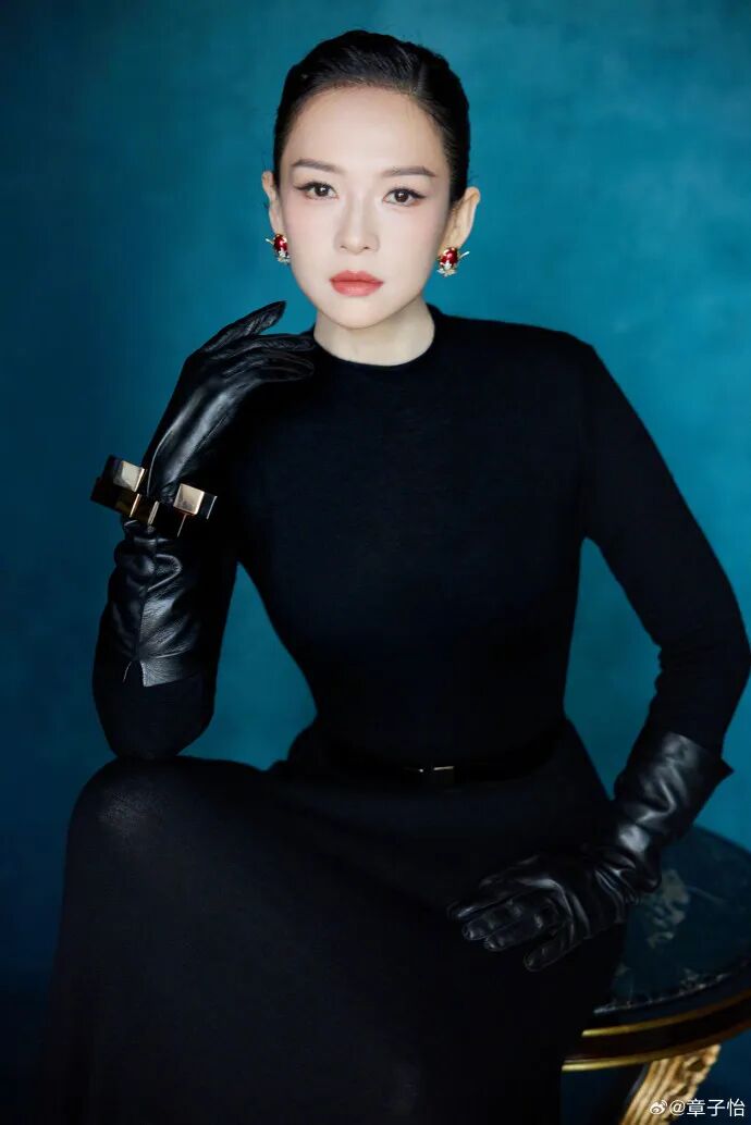 照片中,章子怡一身全黑造型,戴着皮手套,盘起头发,气场强大。