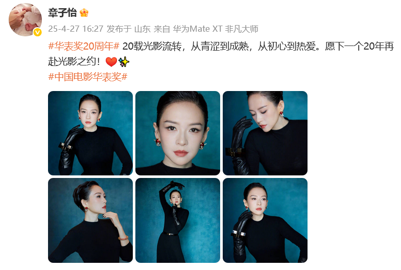 4月27日晚,2025华表奖颁奖活动将在山东青岛举行,数百名电影人齐聚青岛,星光熠熠。当天,章子怡发文庆贺华表奖20周年。