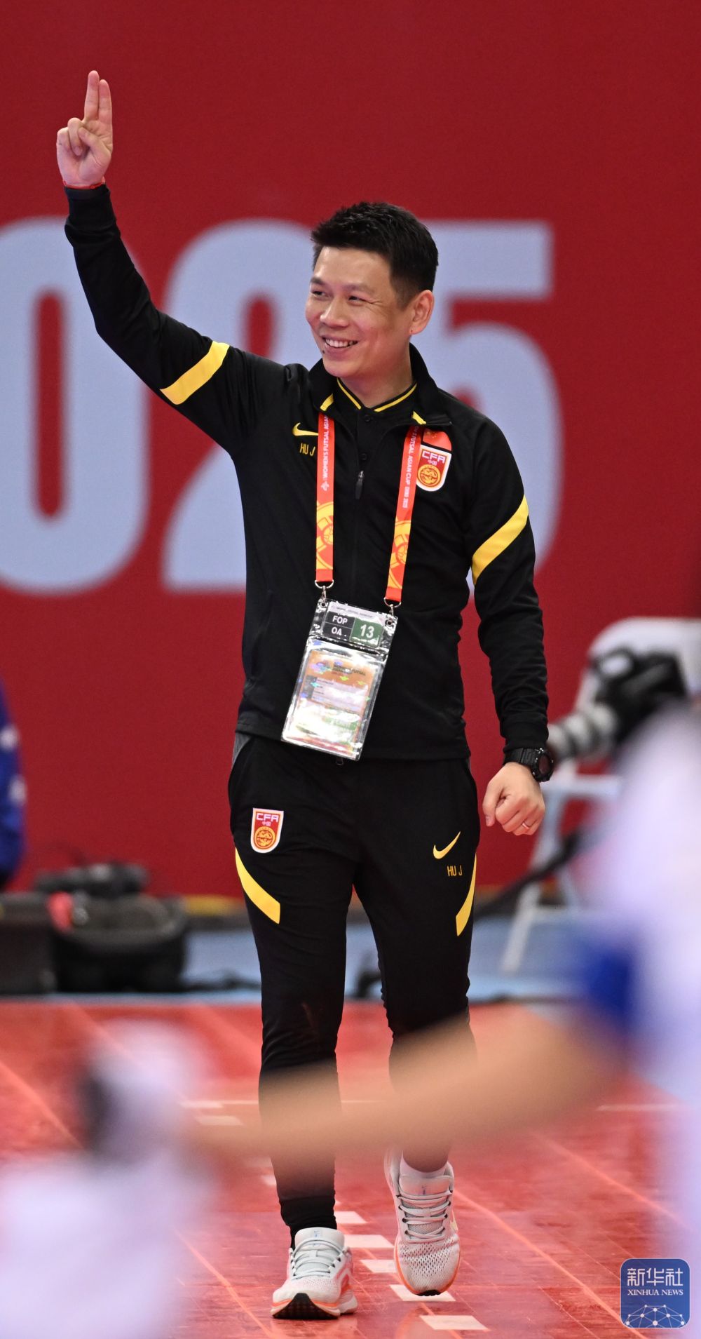 ↑中国队主教练胡杰在场边庆祝进球。