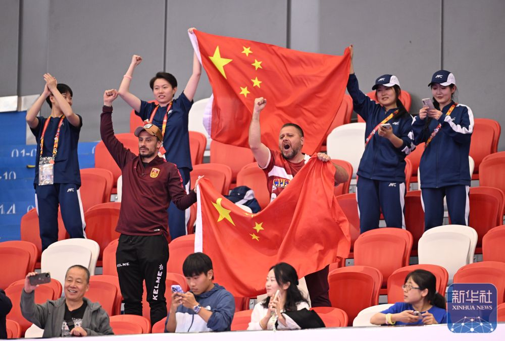 ↑观众在看台上为中国队加油。