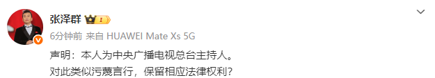张泽群写道:“声明:本人为中央广播电视总台主持人。对此类似污蔑言行,保留相应法律权利?”