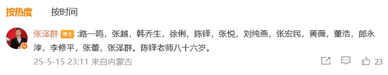 张泽群在评论区补充写道:“路一鸣,张越,韩乔生,徐俐,陈铎,张悦,刘纯燕,张宏民,黄薇,董浩,郎永淳,李修平,张蕾,张泽群。陈铎老师八十六岁。”