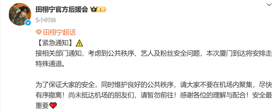 工作室还称在厦门到达时,田栩宁将安排走特殊通道,请粉丝有序撤离。