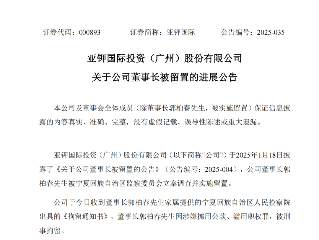 公告称,亚钾国际于18日收到董事长郭柏春家属提供的宁夏回族自治区人民检察院出具的《拘留通知书》,郭柏春因涉嫌挪用公款、滥用职权罪,被刑事拘留。