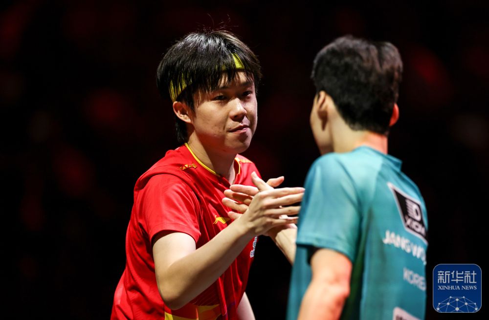 ↑ 王楚钦(左)在赛前与张禹珍握手致意。