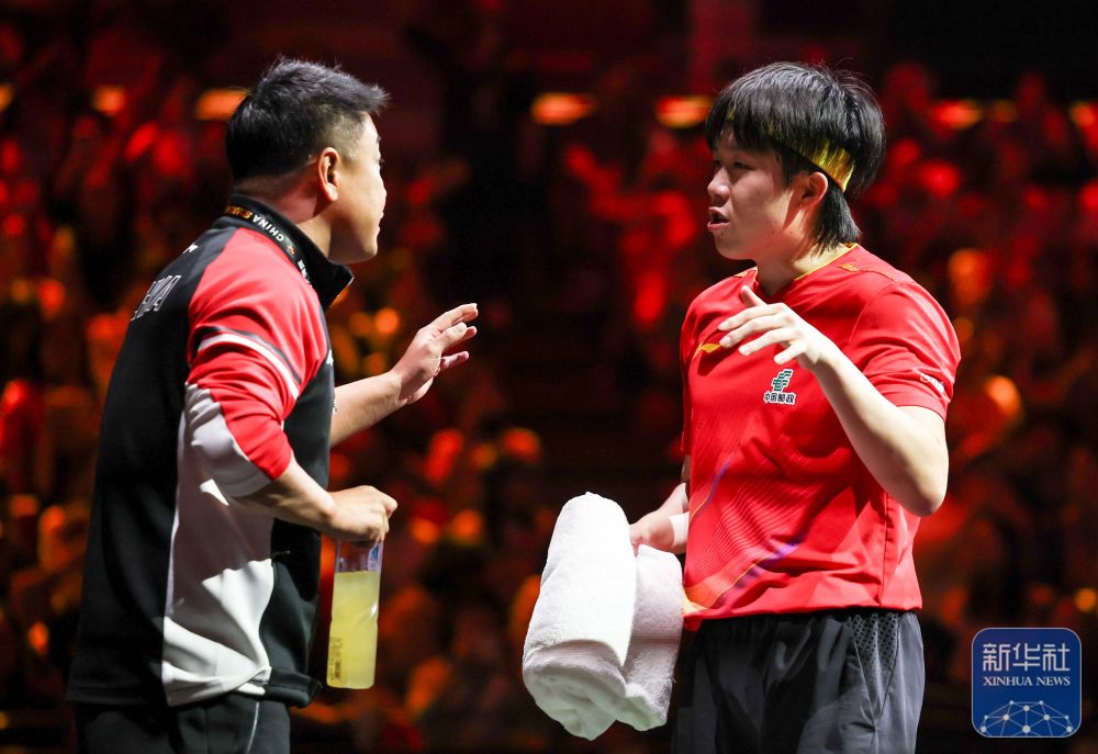 ↑ 王楚钦(右)在比赛间隙与教练王皓交流。