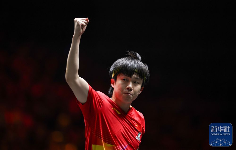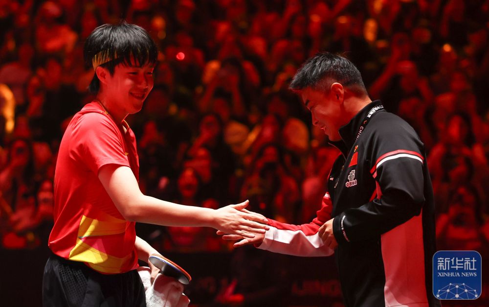 ↑ 王楚钦(右)在比赛后与教练王皓庆祝。